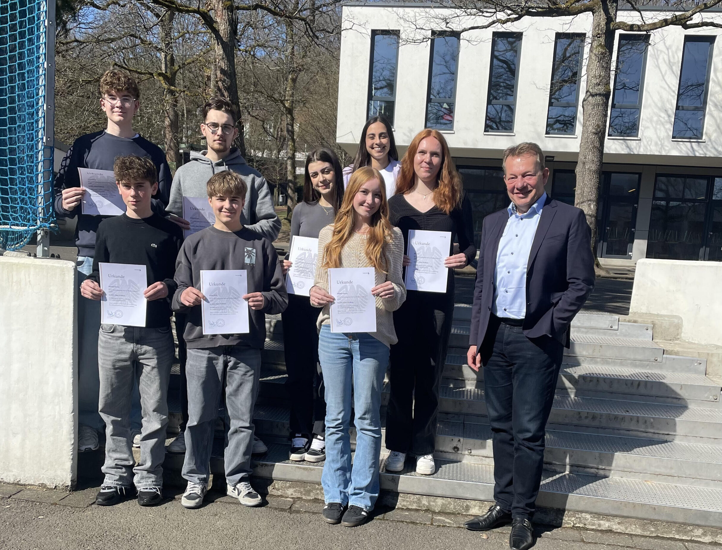 Ein besonderer Höhepunkt war der Besuch des Bürgermeisters, der eigens mit dem Fahrrad anreiste, um den engagierten Wahlhelferinnen und Wahlhelfern persönlich ihre Urkunden zu überreichen. Dabei hob er hervor, wie zentral Wahlen für eine lebendige Demokratie sind, und würdigte den Einsatz aller Beteiligten. Immerhin war es bereits sein dritter Besuch im Rahmen unserer Juniorwahlen.