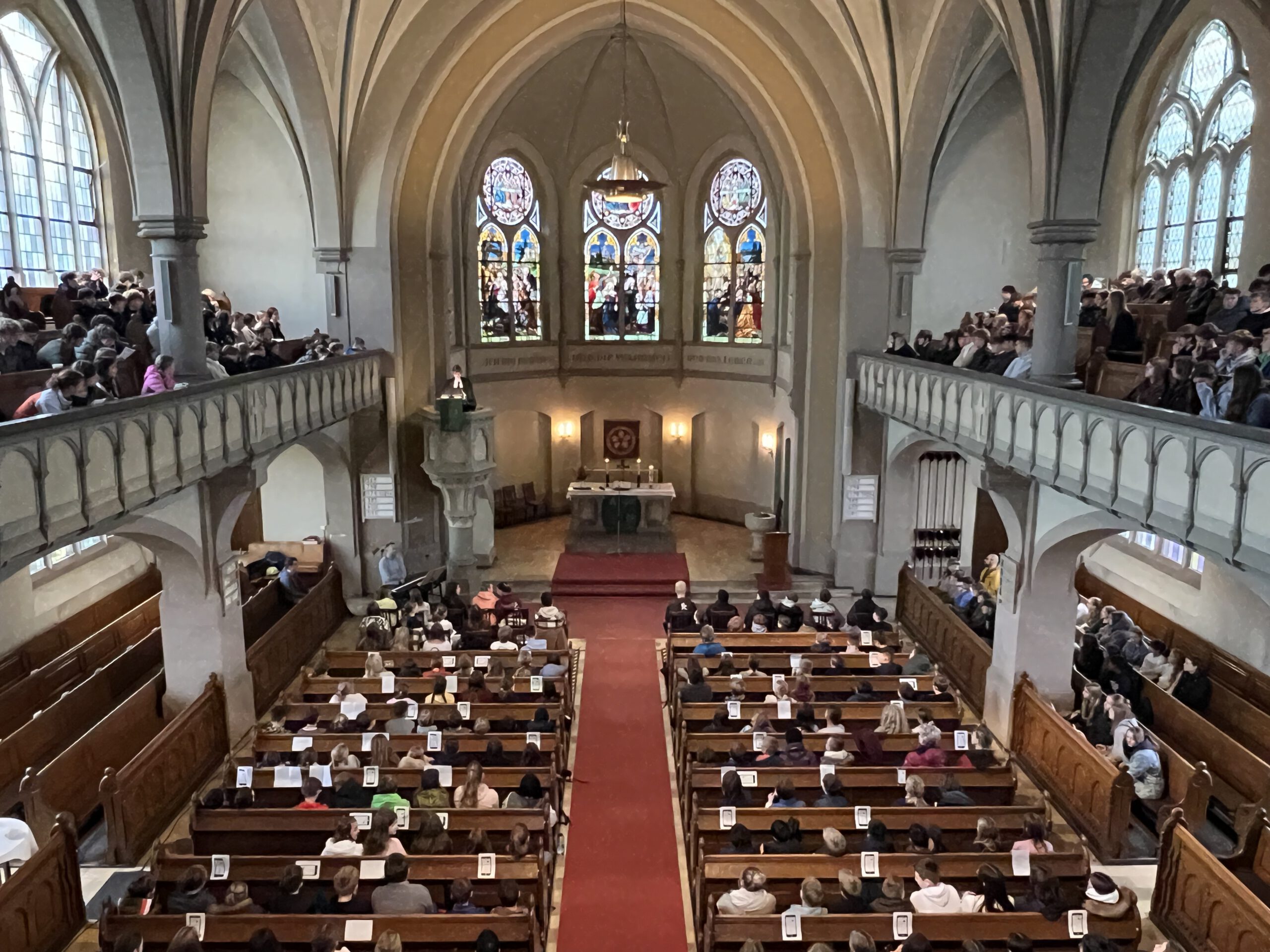 Besonders eindrücklich war die Mitarbeit der Schülerinnen und Schüler. Mit einem kurzen Anspiel brachten sie die Welt der Likes, Reactions und Follower auf den Punkt: Wie schnell kippt Anerkennung in Abhängigkeit, und wie befreiend ist ein Zuspruch, der bleibt. Die Sprache der Jugendlichen, kleine Szenen aus dem Alltag und humorvolle Spitzen machten die Botschaft greifbar. Auch die Segnung am Ende wurde von den Schülerinnen und Schülern mitgestaltet. In schlichten, persönlichen Worten luden sie die Gemeinde ein, Gottes Ja zu sich anzunehmen und dieses Ja weiterzugeben.