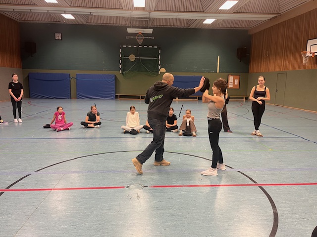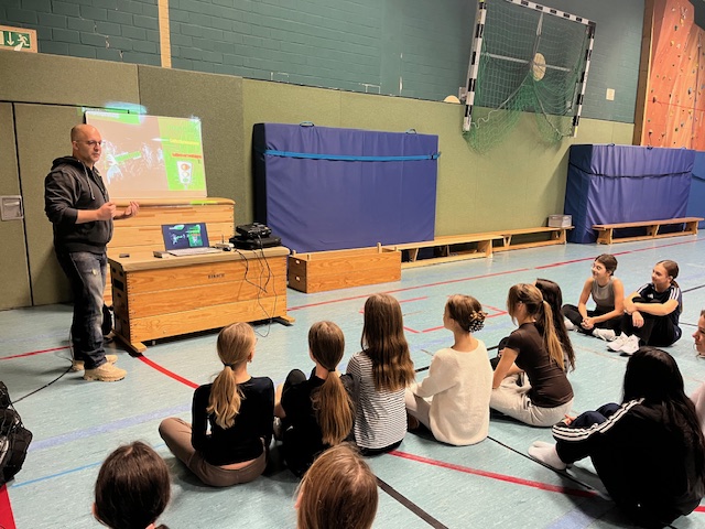 Im Rahmen des Flexkurses „Mädchen sportlich stärken“ war Carsten Zimmermann als Experte für realitätsbasierende Selbstverteidigung zu Gast am evau. In zwei Unterrichtseinheiten erhielten die Schülerinnen (12–14 Jahre) eine kurze Theorieeinheit zum Umgang mit Gefahren und eine intensive Praxiseinheit mit Techniken zur Selbstverteidigung.