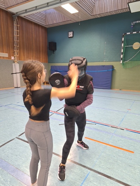 Geübt wurden Einzeltechniken zu Schlägen und Tritten sowie Handlungsabfolgen für konkrete Situationen. Besonders eindrücklich war die realitätsnahe Erprobung einer Handlungsabfolge an Frau Stieber im Vollschutzanzug: So wurde spürbar, wie wichtig klare Abläufe, Haltung und Entschlossenheit sind. Viele Schülerinnen nahmen vor allem eines mit: mehr Sicherheit in der Frage, wie sie sich als junge Frau schützen können.