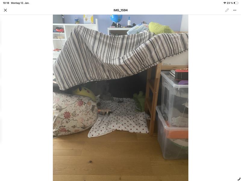 Im Distanzunterricht am Montag wurde es dann noch ein bisschen abenteuerlicher: Die 6b hat Höhlen gebaut – aus Decken, Stühlen, Kissen und allem, was stabil genug aussah, um ein Dach zu tragen.